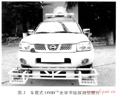 車(chē)載式OMDTM光學(xué)甲烷探測(cè)儀是專(zhuān)門(mén)為埋地天然氣管網(wǎng)及集輸管線(xiàn)設(shè)計(jì)的氣體檢漏裝置,其照片如圖2所示。紅外燈柱探測(cè)器安裝在檢測(cè)車(chē)前,可在各種環(huán)境條件下運(yùn)行,不會(huì)因光柱上的塵土雪水等而引起吸收頻率的微小波動(dòng);檢測(cè)儀響應(yīng)速度快,可檢測(cè)低于1ppm(1ppm=1mg/kg,下同)濃度的甲烷泄漏,速度高達(dá)10000次/s,且穩(wěn)定性好,自身不會(huì)引起檢測(cè)系統(tǒng)發(fā)熱,系統(tǒng)工作穩(wěn)定性好。另外,0MDTM內(nèi)部有刻度校準(zhǔn)器,能夠在任何時(shí)間檢驗(yàn)探測(cè)儀和設(shè)備是否正常運(yùn)行,檢測(cè)數(shù)據(jù)和GPS數(shù)據(jù)通過(guò)端口與PC連接便于數(shù)據(jù)分析與存儲(chǔ)。