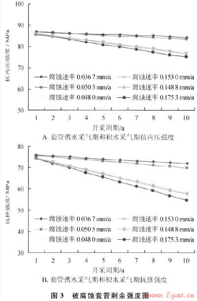 由圖3可知,隨套管使用年限的增加,套管抗內(nèi)壓強(qiáng)度和抗擠強(qiáng)度呈直線下降且腐蝕速率越大套管的剩余強(qiáng)度降低得越快,套管在積水采氣期腐蝕較嚴(yán)重。