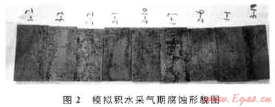 從表2中數(shù)據(jù)可以看出,在含地層積水采氣期材料的腐蝕速率較高。圖2為試片腐蝕后形貌圖。