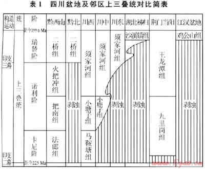 發(fā)生在三疊紀(jì)中晚期的印支二幕運(yùn)動(dòng),結(jié)束了揚(yáng)子地臺漫長的海相沉積歷史,在上揚(yáng)子地區(qū)的晚三疊世形成了從殘留海相地層到陸相地層的地層沉積序列。以現(xiàn)今的四川盆地為代表,晚三疊世地層為一套西厚東薄、北薄的楔狀體。川西地區(qū)上三疊統(tǒng)包括海相-海陸過渡相的馬鞍塘組(垮洪洞組)、小塘子組(現(xiàn)已合稱為須一段)及須家河組(對應(yīng)須二段及其以上地層),地層厚逾4000m。川中地區(qū)上=疊統(tǒng)厚500~600m。新近完鉆的立18井須一段巖心中見石英砂巖,并在頁巖中發(fā)現(xiàn)海相雙殼類化石,更證實(shí)了須瀝積期的殘余海灣已延伸至川中地區(qū)。經(jīng)川東到鄂西醛秭歸上三疊統(tǒng)變薄相變?yōu)楹穸葍H數(shù)十米的“沙溪鎮(zhèn)”組粗碎屑沉積。經(jīng)川南到貴州西部、北部大部分地區(qū)也變薄相變?yōu)閿?shù)十米至不足200m厚的“二橋組”粗碎屑河流相砂巖沉積(表1)。