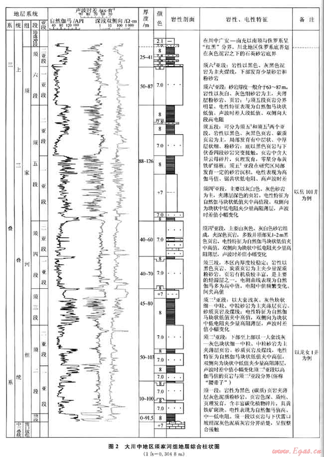 本文所指的四川盆地大川中地區(qū)地理位置北至營山-鹽亭一線,西達(dá)威遠(yuǎn)-八角場,南抵大足-威遠(yuǎn),東接華鎣山,面積達(dá)4×104km2(圖1)。該研究區(qū)是近年來四川盆地天然氣勘探開發(fā)的重要區(qū)域之一。大川中地區(qū)上三疊統(tǒng)須家河組地層縱向上可劃分為須一段-須六段6個(gè)巖性段,其中須一、須三、須五段巖性以泥頁巖夾煤層為主,須二、須四、須六段則為砂巖夾泥頁巖(煤)。侏羅系底界劃分意見:在川中南部地區(qū)以“紅黑”原則將侏羅系底界劃在紅色泥巖之下出現(xiàn)的砂巖底界;而川北地區(qū)如龍崗、八角場地區(qū)則劃在灰色泥巖之下的石英砂巖底界。其中須二、須四段基本上以其中部的泥巖段(須二段中部泥巖段,現(xiàn)場稱為“腰帶子”)又劃分為2個(gè)亞段,須六段也按巖性劃分出2個(gè)亞段(圖2)。