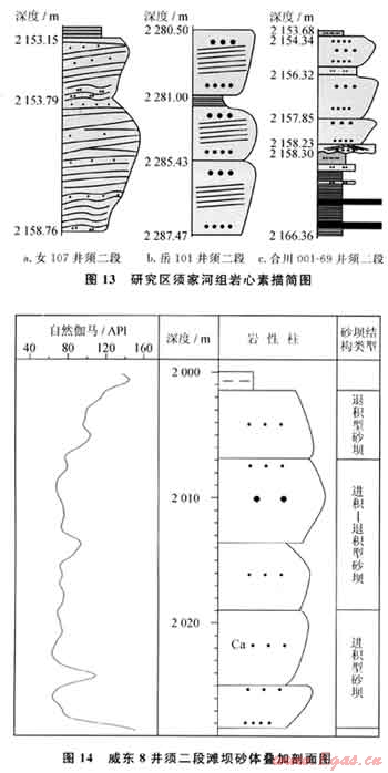 具正粒序的砂體,自然伽馬測井曲線常呈鐘形,往往被解釋為河流砂體,這是導(dǎo)致須家河組解釋為三角洲相的一個(gè)基本因素。經(jīng)巖心觀察及微觀研究,具鐘形形態(tài)的砂體除河流體外,另外是風(fēng)暴巖砂體和退積式砂壩(可能類似于羅啟后教授稱的水進(jìn)河床砂)。退積式砂壩系指當(dāng)湖平面上升速度大于灘壩砂體加積速度時(shí),灘壩砂體退積式沉積,其上部最終演化成湖盆細(xì)粒沉積物的粉砂坪或泥坪,亦可稱之為等效湖進(jìn)灘壩。與這種退積式灘壩伴生的下部地層多為進(jìn)積式的灘壩疊加體,而向上為較深水的泥巖(圖14)。