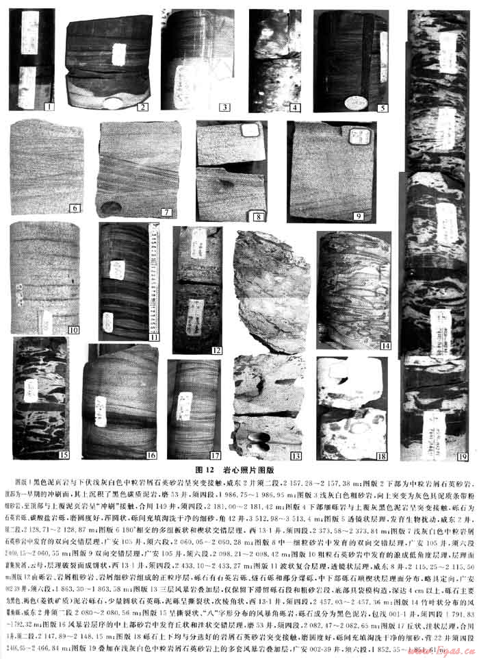 元壩、廣安、南充、合川地區(qū)各段巖心中均見風(fēng)暴巖,重慶代家溝露頭等也見風(fēng)暴巖沉積。據(jù)觀察總結(jié),研究區(qū)風(fēng)暴巖有疊加在濱淺湖砂壩上、分布于淺湖泥及壩后沼澤中3種分布形式。疊加在濱淺湖砂壩上的風(fēng)暴巖反映了較強(qiáng)的風(fēng)暴浪作用,風(fēng)暴巖層底面對下伏淺灰色巖屑石英砂巖強(qiáng)烈沖刷,有的可形成袋模構(gòu)造(圖12-13)。下部的滯積礫石大多數(shù)為撕裂狀或竹葉狀或具塑性變形的泥巖礫、煤礫、碳質(zhì)泥巖礫或粉細(xì)砂巖礫,礫石呈“八”字形排列或雜亂分布(圖12-14~15)。向上砂巖略顯平行層理或出現(xiàn)丘、洼狀交錯(cuò)層理(圖12-16~17)。由于多次風(fēng)暴作用,往往形成不完整的風(fēng)暴巖疊置層序(圖12-19)。風(fēng)暴巖不會出現(xiàn)在河流環(huán)境,在海洋和湖泊環(huán)境(特別是大湖)是極常見的。