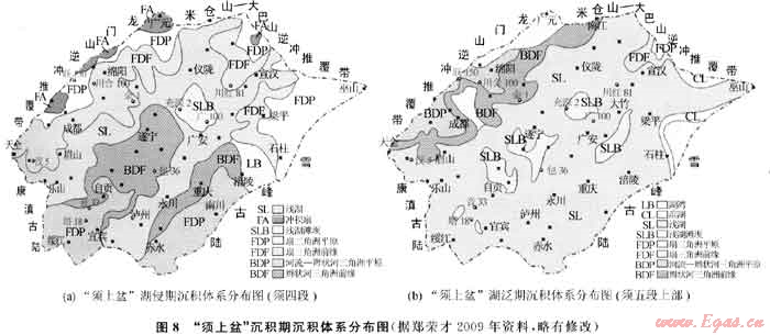 2) 受“安縣運動”影響[22],沿造山帶前緣普遍發(fā)育有大規(guī)模的沖積扇-扇三角洲沉積體系,而川中前陸隆起帶和川東南坳陷帶仍為河流-辮狀河三角洲沉積體系的繼承性發(fā)育區(qū),圍繞前陸隆起帶的3個前緣坳陷中心區(qū)依然以發(fā)育湖泊沉積體系為主,從總體上看,“須上盆”繼承了“須下盆”構造-沉積格局的基本特征。