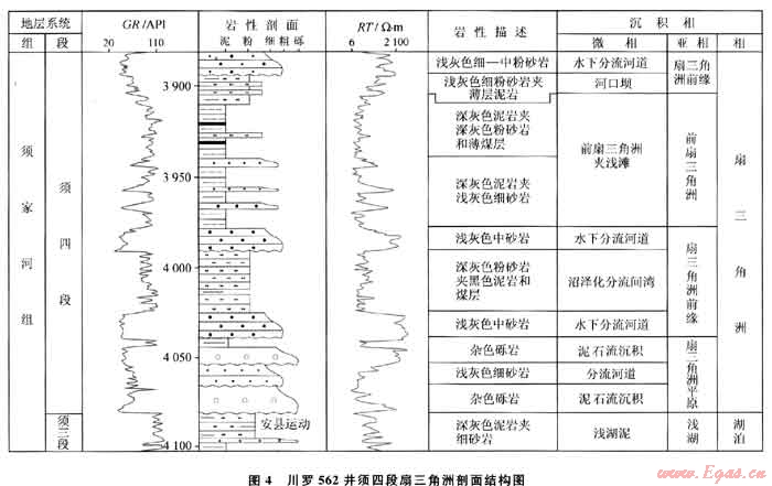 主要指與四川類前陸盆地構造演化有關的沉積充填類型和序列,據(jù)已有研究成果[10~11],盆-山耦合過程中須家河組的沉積學響應可粗分為以下2種基本情況:①強烈構造活動期,對應的沉積學響應過程為粗碎屑巖占有很大比例的沖積扇(或扇三角洲)→辮狀河三角洲→湖泊沉積體系演化序列,發(fā)育粒度向上變細的退積層序;②構造活動平靜期,對應的沉積學響應過程為含煤碎屑巖建造為特征的辮狀河三角洲→湖泊-沼澤沉積體系演化序列,在三角洲沉積區(qū),具粒度向上加粗變淺的加積→進積層序,而在湖泊沉積區(qū),具向上變淺的沉積序列。