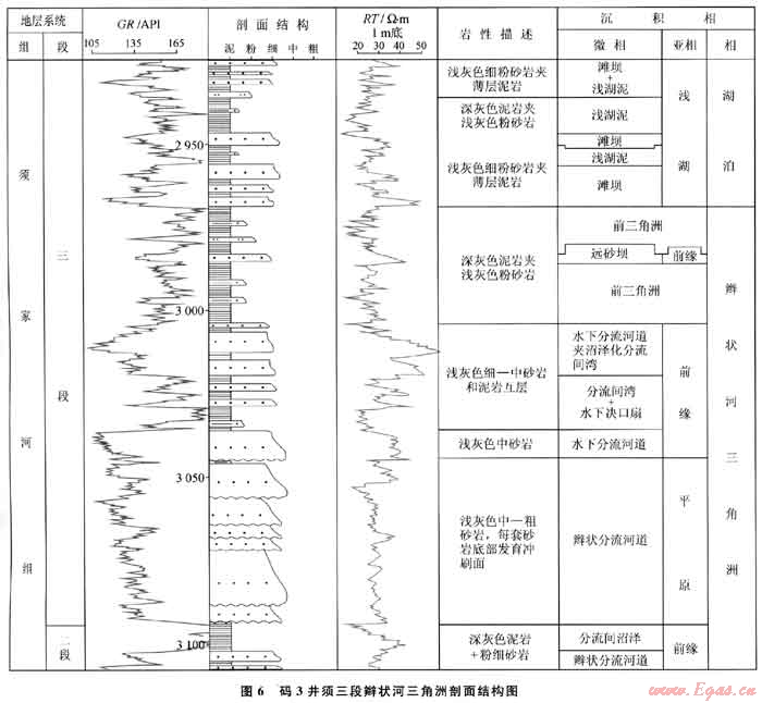 無論是辮狀河還是曲流河三角洲,都可劃分為三角洲平原、三角洲前緣和前三角洲3個亞相。以廣為發(fā)育的辮狀河三角洲為例(圖6):