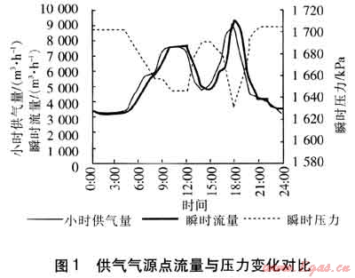 再來分析流量和壓力波動的峰谷比(流量或壓力的最大值與最小值之比)。盡管小時供氣量和瞬時流量的波動幅度很大,瞬時壓力也在同步反向波動,但壓力波動的幅度相對很小。從表2的數(shù)據(jù)可以計算出氣源點壓力的峰谷比為1.048,比流量峰谷比2.769小了很多。這一結果主要說明了在氣源最大供氣量大于實際最大用氣量時,盡管小時用氣不均勻性很明顯,但并不存在用氣高峰階段的用氣缺口,因此也基本不存在傳統(tǒng)意義上的小時調(diào)峰,但壓力波動的存在,依然證明了管網(wǎng)儲氣的調(diào)節(jié)作用。