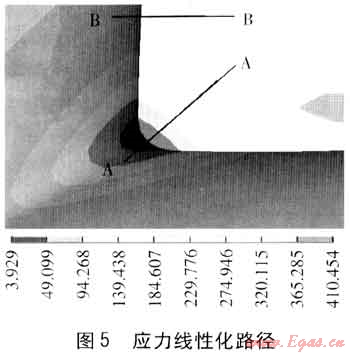 通過分析結(jié)果云圖可以查看管件應(yīng)力的分布情況。本例模型應(yīng)力最大點位于管件焊縫體內(nèi)側(cè),在最高工作壓力為4.0MPa時材料最大主應(yīng)力為410.454MPa。最大應(yīng)力點位于焊縫體內(nèi)側(cè)的圓角過渡處,該區(qū)域為整個模型受力最集中的區(qū)域且其他區(qū)域的應(yīng)力均遠遠小于該區(qū)域,故僅對該區(qū)域進行應(yīng)力評定和疲勞評定即可確定模型工作條件下的安全性。