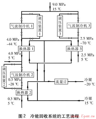 9.0MPa、15℃的天然氣分別進(jìn)入氣波制冷機(jī)1、3獲取冷能,壓力、溫度分別降至4.0MPa、-44℃和2.5MPa、-70℃,經(jīng)過換熱器1、3后溫度升至5℃。