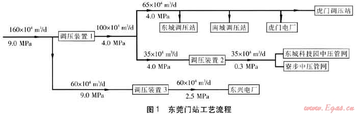 東莞門站工藝流程見圖1。出站的天然氣壓力等級(jí)有3種,分別為:①供應(yīng)東城、南城、虎門調(diào)壓站、虎門電廠,處理量為65×104m3/d,由調(diào)壓裝置1實(shí)現(xiàn)壓力由9.0MPa降至4.0MPa;②供應(yīng)東城科技園、寮步中壓管網(wǎng),處理量為35×104m3/d,由調(diào)壓裝置2實(shí)現(xiàn)壓力由4.0MPa降至0.3MPa;③供應(yīng)東興電廠(每天發(fā)電時(shí)間為16h左右),處理量為60×104m3/d,由調(diào)壓裝置3實(shí)現(xiàn)壓力由9.0MPa降至2.5MPa。