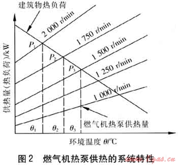 燃?xì)鈾C(jī)熱泵供熱的系統(tǒng)特性見圖2,顯示了燃?xì)鈾C(jī)在不同轉(zhuǎn)速時(shí),熱泵能提供的供熱量與建筑物在不同環(huán)境溫度下所需熱負(fù)荷之間的關(guān)系。假設(shè)在滿足建筑物最大熱負(fù)荷(即壓縮機(jī)最大負(fù)荷,P1點(diǎn))條件下確定傳動比,此時(shí)燃?xì)鈾C(jī)具有最好的經(jīng)濟(jì)性,即燃?xì)鈾C(jī)工作在經(jīng)濟(jì)轉(zhuǎn)速區(qū)間內(nèi),熱泵的其他工作狀態(tài)點(diǎn)(P2,P3等點(diǎn))也都唯一確定。而實(shí)際E燃?xì)鈾C(jī)熱泵大部分時(shí)間都處于部分負(fù)荷運(yùn)行狀態(tài),最大負(fù)荷運(yùn)行時(shí)間不超過總運(yùn)行時(shí)間的10%。因此當(dāng)機(jī)組處于部分負(fù)荷運(yùn)行狀態(tài)時(shí),以最大負(fù)荷工況確定的傳動比將使燃?xì)鈾C(jī)低效率運(yùn)行,燃料消耗量大,全年運(yùn)行經(jīng)濟(jì)性差。因此單級傳動比是以犧牲燃?xì)鈾C(jī)的經(jīng)濟(jì)性為代價(jià)來滿足壓縮機(jī)的動力性要求,且當(dāng)建筑物熱負(fù)荷變化范圍較大時(shí),燃?xì)鈾C(jī)在低速、低負(fù)荷狀態(tài)下工作時(shí),可能會出現(xiàn)燃?xì)鈾C(jī)效率過低的問題。因此,這種方案并不理想。
