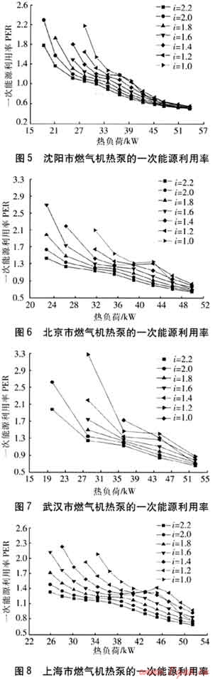 由圖5~8可知:①在供暖季節(jié)使用燃?xì)鈾C(jī)熱泵,若采用單級傳動比,則高傳動比時(shí)的一次能源利用率比較低。即傳動比越大,燃?xì)鈾C(jī)熱泵的運(yùn)行越不經(jīng)濟(jì)。②相同傳動比的燃?xì)鈾C(jī)熱泵,其一次能源利用率隨緯度的升高而降低。③熱負(fù)荷較小時(shí),低傳動比燃?xì)鈾C(jī)的輸出功率無法滿足壓縮機(jī)的功率需求,此時(shí)燃?xì)鈾C(jī)會熄火甚至無法啟動。只有通過增大燃?xì)鈾C(jī)的節(jié)氣門開度,提高燃?xì)鈾C(jī)的轉(zhuǎn)速來滿足需要的熱負(fù)荷,但此時(shí)燃?xì)鈾C(jī)已處于高速低效工作區(qū),機(jī)組的經(jīng)濟(jì)性較差。④當(dāng)熱負(fù)荷較小時(shí),燃?xì)鈾C(jī)熱泵的一次能源利用率較高,原因是:a.工作環(huán)境改善使熱泵的供熱系數(shù)比較高;b.當(dāng)熱負(fù)荷較小、燃?xì)鈾C(jī)轉(zhuǎn)速較低時(shí),供熱量中回收的燃?xì)鈾C(jī)余熱比例較大;c.當(dāng)熱負(fù)荷最大時(shí),燃?xì)鈾C(jī)熱泵在4個(gè)城市中的一次能源利用率都比較低,約為0.6~0.8,但這種惡劣極端天氣的時(shí)間在供暖期中所占的比例很小。d.在熱負(fù)荷為30~40kW(供暖時(shí)間比較集中)時(shí),采用不同單級傳動比的燃?xì)鈾C(jī)熱泵,其一次能源利用率較高,基本都大于1.2。