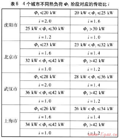 遵循多級傳動比的確定原則,結(jié)合單級傳動比的計(jì)算結(jié)果,針對4個(gè)城市的不同熱負(fù)荷階段,確定了采用多級傳動比的燃?xì)鈾C(jī)熱泵的不同傳動比i(即檔位),見表6。