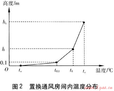 在分析置換通風(fēng)房間溫度控制時,設(shè)定室內(nèi)溫度在垂直方向上具有線性變化規(guī)律。距地面0.1m處是人體腳踝的位置,腳踝是人體暴露于空氣中的敏感部位,因此該高度的空氣溫度t0.1不應(yīng)引起人體的不適。從舒適度出發(fā),設(shè)計人員往往關(guān)心的是人員頭部與腳踝之間的溫差。采用置換通風(fēng)時,室內(nèi)溫度變化由3部分組成: