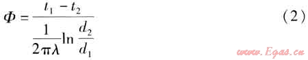 蒸汽輸送過程中,單位長度管道的熱損失可根據(jù)圓筒體的導(dǎo)熱微分方程[4]計算得到。忽略蒸汽和管壁的熱阻,可得下式: