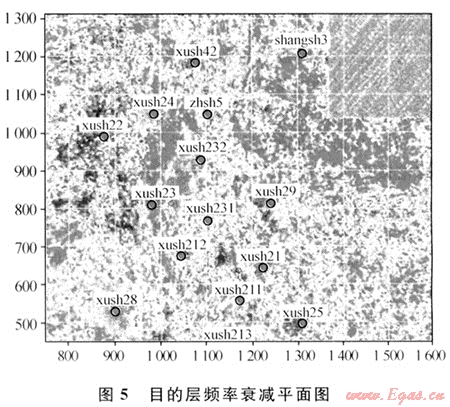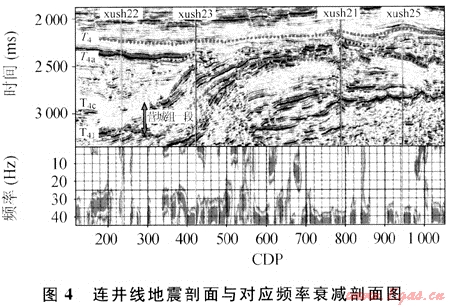 頻率衰減是指地震波在地下巖層中傳播時總能量的損失,包括波前發(fā)散引起的振幅衰減和地層非完全彈性引起的地震波振幅的吸收衰減,屬于介質內在的屬性。不同巖層對地震波具有不同的吸收程度,地層的吸收作用越強,地震波的高頻成分衰減越快;反之亦然。理論研究表明,在地下巖層中,如果孔隙發(fā)育,充填油、氣、水(尤其對于含氣的情況)時,地震反射吸收系數(shù)增大,高頻成分吸收衰減加劇,含油氣地層吸收系數(shù)比相同巖性不含油氣地層高幾倍甚至超出一個數(shù)量級[7~8]。因此,可以利用經(jīng)過目的層前后地震波的頻率衰減屬性進行儲層油氣檢測。