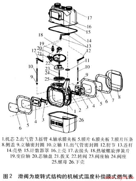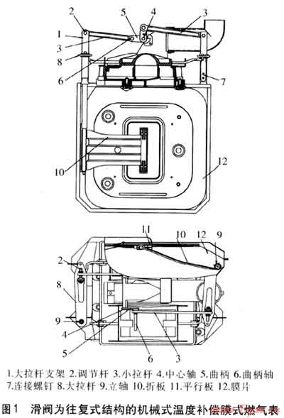 市場上的機(jī)械式溫度補償膜式燃?xì)獗碛袃煞N:一種是滑閥為往復(fù)式結(jié)構(gòu),另一種是滑閥為旋轉(zhuǎn)式結(jié)構(gòu)。