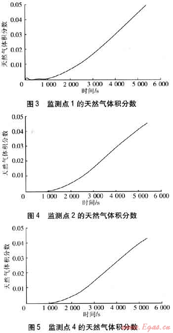 監(jiān)測(cè)點(diǎn)1、2、4的模擬結(jié)果見圖3~5,監(jiān)測(cè)點(diǎn)3、5、6、7的天然氣體積分?jǐn)?shù)曲線與圖4、5相似。