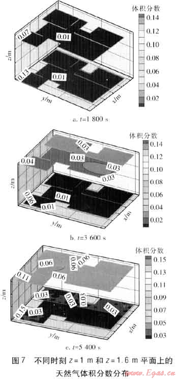 不同時(shí)刻z=1m和z=1.6m平面上的天然氣體積分?jǐn)?shù)分布見圖7。由圖7可知,由于天然氣的密度比空氣小,天然氣泄漏后在垂直方向的擴(kuò)散速度明顯大于在水平方向的擴(kuò)散速度。天然氣在水平方向擴(kuò)散的過程中,由于受到墻壁等障礙物的阻擋區(qū),有利于人們?cè)诎l(fā)生天然氣火災(zāi)初期爭(zhēng)取時(shí)間疏散逃生和滅火救援。天然氣在封閉狀態(tài)下泄漏時(shí),約5400s后z=1.6m平面上的體積分?jǐn)?shù)達(dá)到爆炸極限,且爆炸區(qū)域是一個(gè)有一定厚度的水平區(qū)域,這為人們?cè)谔烊粴庑孤┖蟛扇∮行У拇胧┨峁┝撕芎玫囊罁?jù)。