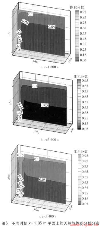 模擬了天然氣泄漏后,x=1.35m平面、z=1m(距離地面1m)平面、z=1.6m平面上的天然氣體積分?jǐn)?shù)隨時(shí)間t的變化規(guī)律。天然氣泄漏1800、3600、5400s后x=1.35m平面上的天然氣體積分?jǐn)?shù)分布見圖6。由模擬結(jié)果可知,天然氣泄漏擴(kuò)散后的體積分?jǐn)?shù)隨與地面垂直距離的增大而增大。不同時(shí)刻天然氣泄漏擴(kuò)散的形態(tài)基本相似,但天然氣的體積分?jǐn)?shù)和所覆蓋的危險(xiǎn)區(qū)域變化較大。