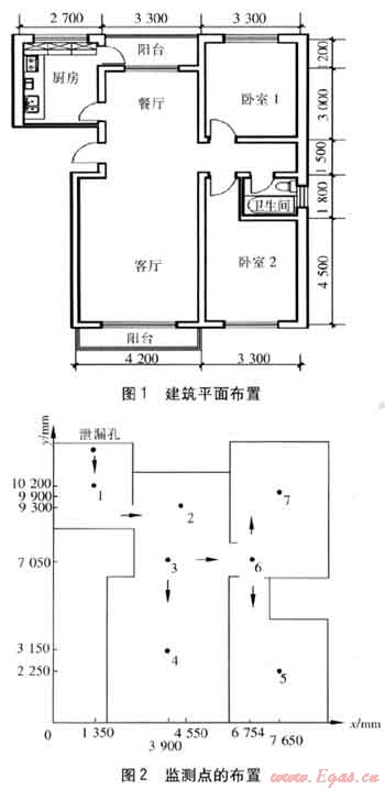 以該二室一廳建筑內(nèi)的廚房天然氣泄漏為例,建筑平面布置見圖1,尺寸單位為mm,房間高3.3m。按照該建筑建立物理模型,天然氣泄漏點(diǎn)設(shè)定在廚房地表面,在室內(nèi)設(shè)置7個(gè)監(jiān)測(cè)點(diǎn),監(jiān)測(cè)點(diǎn)的布置見圖2,監(jiān)測(cè)點(diǎn)距地面1.6m,圖2中的箭頭表示天然氣泄漏后的擴(kuò)散方向。設(shè)室內(nèi)環(huán)境溫度為27℃,壓力為一個(gè)標(biāo)準(zhǔn)大氣壓,墻壁為絕熱,房間處于封閉狀態(tài)。假定天然氣泄漏孔的直徑為25mm,泄漏速度為3m/s。