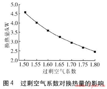 過??諝庀禂?shù)改變會(huì)影響煙氣進(jìn)口溫度[2],也會(huì)引起煙氣流量變化,使煙氣側(cè)換熱效果發(fā)生變化[3]。保持其他參數(shù)不變,過剩空氣系數(shù)從1.5增至1.8。根據(jù)燃燒后煙氣總焓不變的原則,計(jì)算出不同過剩空氣系數(shù)下的煙氣溫度和煙氣流量,代入單管模型進(jìn)行計(jì)算,計(jì)算的換熱量見圖4。過剩空氣系數(shù)每下降0.1,換熱量可增大20%左右。過??諝庀禂?shù)增大時(shí),煙氣流量雖然增加,但因燃燒溫度降低使煙氣流速減小,hf減小,使傳熱量減小。故應(yīng)在保證污染物排放不超標(biāo)的前提下,盡量減小過??諝庀禂?shù)。