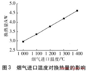 煙氣進(jìn)口溫度受燃?xì)馊紵隣顩r影響,并對傳熱系數(shù)產(chǎn)生影響。保持其他參數(shù)不變,只改變煙氣進(jìn)口溫度,從100℃上升至1400℃,計(jì)算的換熱量見圖3。隨著煙氣進(jìn)口溫度的升高,傳熱系數(shù)增大,換熱量增加,在燃?xì)夂牧坎蛔兊那疤嵯?,可有效地提高熱水器的換熱效率。煙氣進(jìn)口溫度每升高100℃,換熱量可增加10%以上。