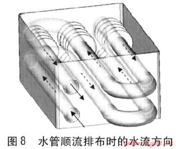順流排布是指水先流經(jīng)下層肋片管,與高溫?zé)煔鈸Q熱,然后流經(jīng)上層肋片管,見圖8。保持各參數(shù)不變,依次對各單管進(jìn)行計(jì)算,直至最后一根肋片管,得到最終的出口水溫。6根肋片管順流排布時(shí)水溫上升22.37℃。