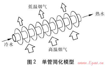 為簡化,將換熱器中嵌布的水管視作末端絕熱的肋片管,水管由若干(5或6)根肋片管依次串聯(lián)而成,肋片視作直管上的等截面環(huán)肋。高溫?zé)煔鈾M掠肋片管,將熱量傳遞給水管中流動(dòng)的冷水。單管簡化模型見圖2。在相同的燃?xì)夂牧亢退髁肯?,水?cè)溫升較大,則認(rèn)為換熱效率較高,故可用出口水溫來衡量肋片管的換熱效率。本研究中比定壓熱容均取相應(yīng)溫度范圍內(nèi)的平均值。