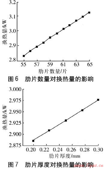 肋片厚度會(huì)影響肋片效率,也影響煙氣通道的面積,改變煙氣流速,進(jìn)而改變換熱量。當(dāng)肋片厚度增加時(shí),肋片效率ηf增大,從而使煙氣側(cè)表面?zhèn)鳠嵯禂?shù)增大,換熱器的換熱效果增強(qiáng)。當(dāng)肋片厚度從0.2mm變化至0.3m時(shí),換熱量的改變見圖7。肋片厚度增加0.1mm,換熱量增加3%。
