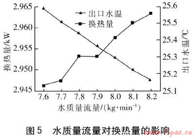 水質(zhì)量流量變化會(huì)引起水的流速變化,影響水側(cè)的傳熱系數(shù),也影響水與煙氣的換熱時(shí)間[4]。保持其他參數(shù)不變,水質(zhì)量流量從7.6kg/min變化到8.2kg/min,換熱量與出口水溫的變化見圖5。由圖5可知,水質(zhì)量流量增大,雖然出水溫度有所下降,但總的換熱量是增加的,換熱器換熱效率提高??梢钥紤]調(diào)節(jié)燃?xì)饬髁颗c調(diào)節(jié)水質(zhì)量流量相結(jié)合來進(jìn)行燃?xì)鉄崴鞯乃疁乜刂?,提升水溫小幅變化時(shí)熱水器的換熱效率。