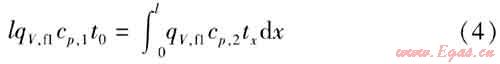 若均流板設(shè)計(jì)不當(dāng),進(jìn)入各火排的燃?xì)饬炕蜻^剩空氣量不同,會(huì)造成燃燒室內(nèi)的煙氣溫度分布不均。假設(shè)煙氣溫度tx沿管程水流方向線性遞增,為水管長度石(單位為mm)的函數(shù):tx=ax+b。為使結(jié)果有可比性,以煙氣溫度為1000℃且均勻分布時(shí)煙氣的焓值為基準(zhǔn),保持煙氣的總焓值不變,則有下式: