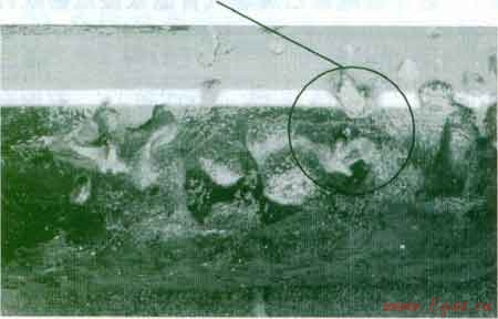 2012年4月,我公司接報(bào)坪山某路段有燃?xì)庑孤?。?jīng)現(xiàn)場檢測確認(rèn)泄漏部位后,進(jìn)行開挖探查。該段為聚乙烯管道,緊鄰路燈,隨橋跨河敷設(shè),埋深約80 crn,且周邊土壤較為潮濕,管道外加鋼質(zhì)套管保護(hù)。開挖后發(fā)現(xiàn)PE管道與鋼質(zhì)套管的間隙被白蟻蟻巢填滿(見圖l)。經(jīng)現(xiàn)場清理后發(fā)現(xiàn)該段PE燃?xì)夤艿朗馨紫佒g大面積破壞,并確認(rèn)燃?xì)庾园紫佒g破壞穿孔處泄漏(見圖2)。