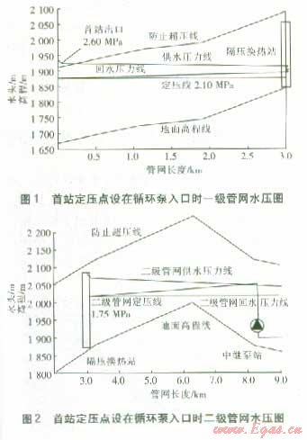 電廠和市區(qū)分別處于山的兩端,首站位于電廠內(nèi),由于系統(tǒng)高差較大,需設(shè)隔壓換熱站l座。從電廠到隔壓換熱站為一級管網(wǎng),設(shè)計壓力為2.5 MPa.設(shè)計供/回水溫度為130/70℃。從隔壓換熱站到小區(qū)熱力站為二級管網(wǎng),設(shè)計壓力為2.5 MPa,設(shè)計供/回水溫度l20/60℃。從熱力站到用戶為三級管網(wǎng),設(shè)計壓力為1.0 MPa,設(shè)計供/回水溫度80/55℃。首站海拔為1 669 m,小區(qū)熱力站(位于市區(qū)內(nèi))海拔約1 850 m,系統(tǒng)最高海拔在二級管網(wǎng)部分,為2 010 m。隔壓換熱站設(shè)在海拔為1 850 m處,距離電廠約3 km,比電廠高181 m。130℃水汽化壓頭為l7.6 m,考慮隔壓換熱站換熱器布置在二層,設(shè)備充水高度為6 m,同時考慮5 m水柱安全余量,一級管網(wǎng)定壓壓頭210 m,即壓力為2.10 MPa,定壓點設(shè)在首站。