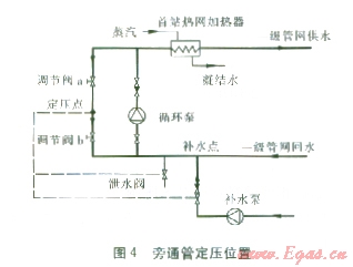 旁通管定壓是把定壓點設(shè)在旁通處的定壓方式。與其他定壓方式不同,旁通管定壓不僅有定壓作用,也有調(diào)壓功能。旁通管定壓系統(tǒng)具有獨到的優(yōu)點:首先造價低,只需在循環(huán)泵兩側(cè)或供回水總管上安裝旁通管及調(diào)節(jié)閥,并保證定壓點與補水泵、泄水閥連鎖。其次運行費用省,與在循環(huán)泵人口補水定壓相比,旁通管定壓補水點的壓力較小,補水泵工作揚程減小,節(jié)省了運行費用。再次,系統(tǒng)安全可靠,通過旁通管調(diào)壓,系統(tǒng)的動壓線大大降低,即運行壓力大大降低,管網(wǎng)與用戶承壓減小,運行更安全。旁通管定壓在一級管網(wǎng)和二級管網(wǎng)中均可使用。