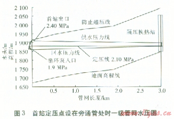 由圖3可見,一級管網(wǎng)采用旁通管定壓后,首站入口壓力為1.9 MPa,出口壓力為2.4 MPa,首站循環(huán)泵出口壓力為2.5 MPa,定壓線仍為2.1 MPa,定壓點設(shè)在旁通管處。此時一級管網(wǎng)最高壓力為2.4MPa,位置在首站出口,滿足不超壓;供水最低壓力為0.5 MPa,在隔壓換熱站人口,滿足l30℃水不汽化;回水壓力最低點在隔壓換熱站出口,壓力為0.3MPa,滿足70℃水不汽化;供、回水動水壓線均在地面線以上,滿足不倒空。此時旁通管上的調(diào)節(jié)閥a節(jié)流壓差為0.4 MPa,調(diào)節(jié)閥b節(jié)流壓差為0.2MPa。