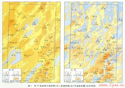 以河道帶為主要背景,以沉積相為指導(dǎo),結(jié)合地震預(yù)測結(jié)果,勾繪出蘇77區(qū)塊主力儲層段砂體及有效砂體厚度等值線圖(圖2)。