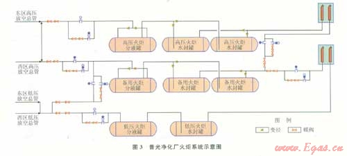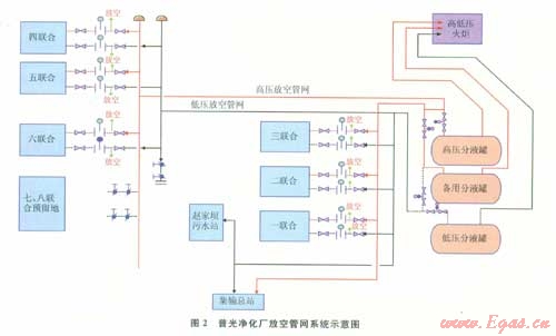 放空管網(wǎng)系統(tǒng)包括從各系列天然氣凈化裝置內(nèi)的放空閥后至高低壓放空分液罐的部分。每系列裝置管廊上的高低壓放空總管經(jīng)位于裝置界區(qū)的高低壓分液罐分離泄放氣中攜帶的脫硫、脫水溶劑后,匯入東西區(qū)高低壓放空管網(wǎng)。東區(qū)高低壓放空管網(wǎng)主要負責(zé)第一、二、三聯(lián)合天然氣凈化裝置、趙家壩污水站及集氣總站的放空需要,西區(qū)高低壓火炬放空管網(wǎng)主要負責(zé)第四、五、六聯(lián)合天然氣凈化裝置的放空需要。東西區(qū)高壓放空管網(wǎng)并行進入高壓放空分液系統(tǒng),東西區(qū)低壓放空管網(wǎng)匯合成低壓放空總管后進入低壓放空分液系統(tǒng)。