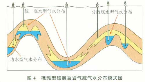 針對這些問題,綜合巖性、電性、物性及微觀孔隙結(jié)構(gòu)的研究,在儲(chǔ)層發(fā)育規(guī)律研究的基礎(chǔ)上研究氣藏氣水分布特征,弄清氣水分布控制因素,建立氣水分布模式有利于制定合理的碳酸鹽巖氣藏開發(fā)方式,確定礁灘型碳酸鹽巖氣藏高效開發(fā)技術(shù)對策,保證這一類型氣藏的高效開發(fā)。