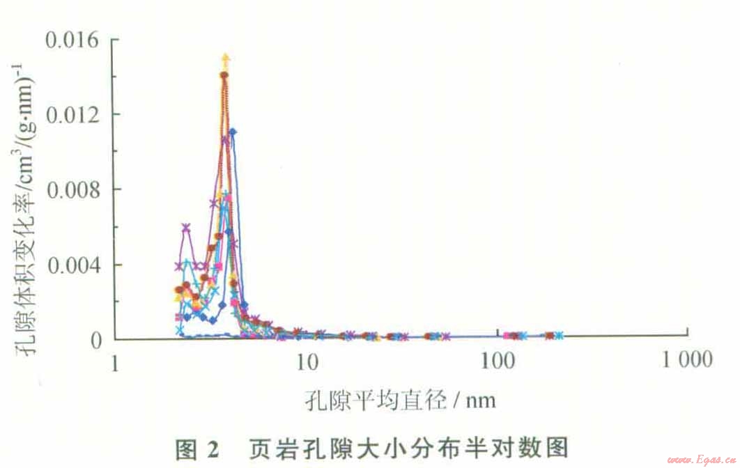 頁巖氣藏具有不同于常規(guī)氣藏的特殊性,它既是烴源巖又是儲層,是生物成因、熱成因或者生物 熱成因的連續(xù)型聚集,運移距離較短,基本屬于自生自儲型氣藏[2-4]。其天然氣賦存狀態(tài)多種多樣,具有獨特的存儲特征。主要表現(xiàn)為:在形式上游離氣和吸附氣并存;在存儲空問上基質(zhì)孔隙和次生裂縫并存。頁巖氣藏中天然氣由3部分組成:裂縫中的游離氣、基質(zhì)孔隙中的游離氣和吸附氣[5]。頁巖氣的儲層特征以及吸附特征是評價頁巖是否具有開采價值的一個重要標(biāo)準(zhǔn)。為此,以某一頁巖氣藏為例,對此進(jìn)行研究。