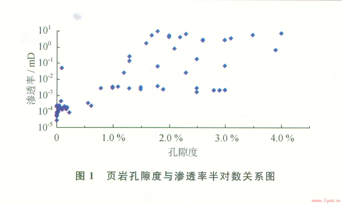 利用PoroPerm 200型孔滲儀對該頁巖氣藏的巖心進(jìn)行孔隙度與滲透率測量,實驗中滲透率的測試方法為脈沖測試法,發(fā)現(xiàn)該頁巖的孔隙度主要分布在0.01%~5%,滲透率主要分布在0.000 01~10 mD,頁巖的孔隙度與滲透率沒有明顯的相關(guān)關(guān)系(見圖1)。滲透率大于l mD的頁巖巖心中存在著明顯的天然裂縫或取心誘導(dǎo)裂縫。