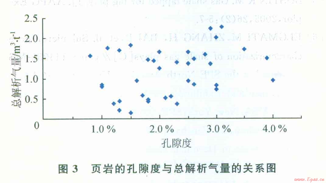 圖3是頁巖氣的總解析氣量與頁巖的孔隙度的關(guān)系圖,從圖中可以看到該頁巖氣藏的孔隙度與總解析氣量并沒有明顯關(guān)系。圖4是頁巖的總解析氣量與TOC關(guān)系圖,從圖中可以看到兩者存在著明顯的正相關(guān)關(guān)系,隨著頁巖的有機質(zhì)含量的增加,頁巖的總解析氣量也是增加的。美國5大頁巖具有豐富的有機質(zhì)含量,其TOC大多介于l.5%~20%,通常認(rèn)為總有機質(zhì)含量超過0.5%的頁巖是具有潛力的烴源巖。通過對該頁巖氣藏巖心的有機地化分析,其TOC介于0.5%~5%,其TOC使其可能成為具有潛力的烴源巖。根據(jù)美國和加拿大的勘探開發(fā)結(jié)果,對于熱成因的頁巖氣藏,形成頁巖氣的頁巖有機質(zhì)成熟度(R。,)值為0.4%~3.o%。陔頁巖氣藏的R。值范圍為2.75%~3.92%,R。值超過3%說明處于過成熟范圍,會影響頁巖氣體的吸附量。