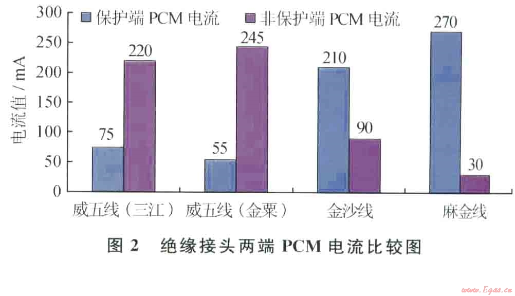 采用RD PCM埋地管線外防腐層檢測儀測試絕緣接頭的漏電比率。將RD PCM儀器的發(fā)射機(jī)架設(shè)在絕緣接頭保護(hù)端,輸送300mA的PCM電流,利用接收機(jī)檢測出有很大部分PCM電流經(jīng)絕緣接頭流人非保護(hù)端(如圖2中威五線(金粟)絕緣接頭兩端的PCM電流顯示絕大部分PCM電流流入了非保護(hù)一端的站場)。