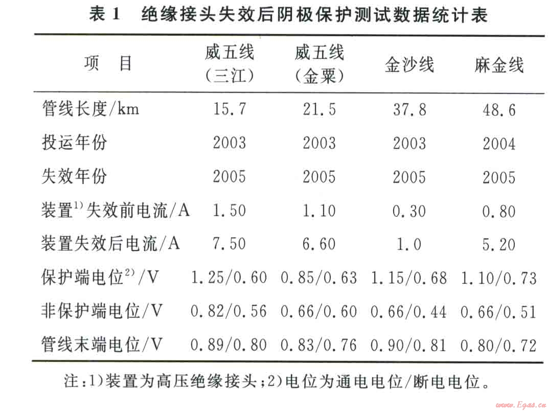 金山輸氣站是麻柳場氣田進(jìn)氣的集輸站,日輸氣量100×104m3,共有4條輸氣管線,建有l(wèi)座陰極保護(hù)站,分別向“威五線(三江)”、“威五線(金粟)”、“麻金線”、“金沙線”4條管線送電,在各條管線的進(jìn)出站端安裝有絕緣接頭裝置。從表l中可見絕緣接頭失效后陰極保護(hù)系統(tǒng)出現(xiàn)的現(xiàn)象。
