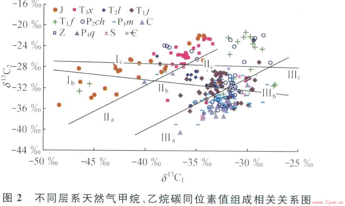 圖2不同層系天然氣甲烷、乙烷碳同位素值組成相關(guān)關(guān)系圖