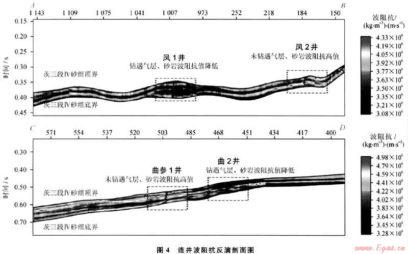 為了對含氣地層的波阻抗特征進行分析,選取7兩條連井剖面(剖面位置見圖1)AB和CD來進行對比,其波阻抗值特征如圖4所示。其中,AB剖面過鳳1井和鳳2井,鳳1井在目的層段發(fā)現(xiàn)氣層,CD剖面過曲參1井和曲2井,曲2井在目的層段鉆遇氣層,其他兩口井在茨營組三段Ⅳ砂組為不含氣砂巖地層。