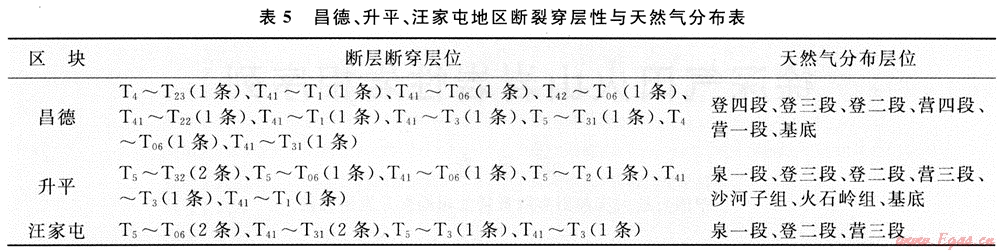 由表2中可以看出,徐家圍子斷陷以登二段為界下部主要發(fā)育的是從基巖或沙河子組或營城組斷至T32之下的斷裂,上部主要發(fā)育T32~T2、T31~T2、T3~T2的斷裂。斷裂的這一分布特征使得登二段以上蓋層被斷裂破壞程度小,使得其下天然氣大規(guī)模富集。然而,在升平、汪家屯和昌德地區(qū)局部發(fā)育有穿過登二段蓋層的斷裂,昌德地區(qū)有10條,升平地區(qū)有7條,汪家屯地區(qū)有9條(表5)。正是這些斷裂的溝通作用,使得登二段蓋層之下的部分天然氣在這些地區(qū)沿斷裂穿過登二段蓋層向上運移,聚集在登三、四段地層和泉一、二段地層中,形成升平、汪家屯和昌德上部氣藏。而其他地區(qū)因無此類斷裂,天然氣不能穿過登二段蓋層向上運移聚集成藏,只能在登二段蓋層之下聚集成藏。
