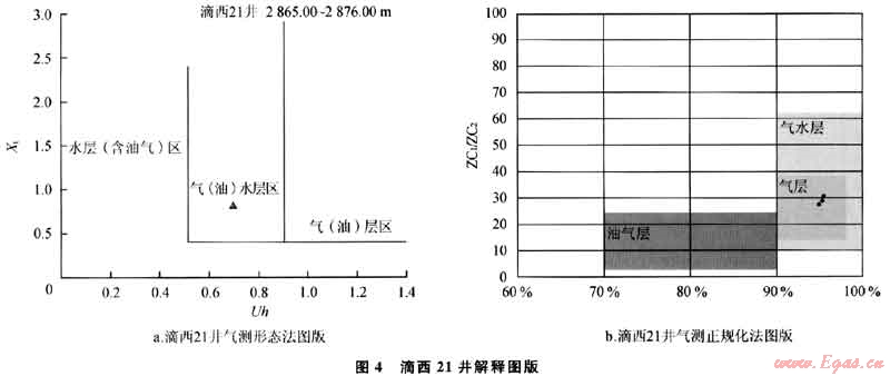 在2867.62~2871.97m井段取心,獲熒光級巖心2.32m,出筒時油氣味淡,巖心表面及氣孔局部一普遍冒氣,噴照熒光10%,暗黃色,弱發(fā)光,系列對比11級,乳黃色,氣測全烴由0.386 9%↑3.5623%,組分出至C5;氣測正規(guī)化圖版解釋為氣層(圖4-a),氣測形態(tài)法解釋為氣水同層(圖4-b)。后效在2867.62m有含水跡象,錄井解釋為氣水同層。后在井段2865.O0~2876.00m試油,日產油0.12t、氣5060m3、水2.65m3,試油結論為氣水同層。