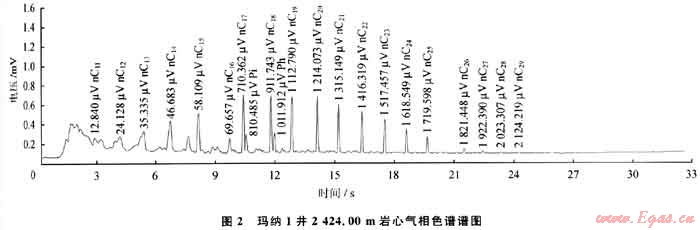 在2423.37~2428.11m井段鉆井取心,獲熒光級巖心2.38m,巖心出筒時新鮮斷面具芳烴氣味,噴照熒光5%,淡黃色,弱發(fā)光,系列對比7級,乳白色,巖心斷面具弱水濕感,滴水擴散,浸水試驗局部冒氣,呈串珠狀。氣測全烴由0.779 2%↑98.5637%,組分出至nC5,氣測正規(guī)化圖版解釋為氣層(圖1-a),氣測形態(tài)法解釋為氣層或油層(圖1-b)。熱解氣相色譜(圖2)氣態(tài)聯(lián)合峰(C8~C12)明顯,正構烷烴組分分布較完整,基線較平直,呈規(guī)則梳狀,碳數(shù)范圍為nC11~nC30,其中輕組分占優(yōu)勢,主峰碳數(shù)為nC14~nC16,∑nC21-/∑nC22+介于4.24~17.65,總峰面積介于14041~28786μV·s,含烴量較大,反映出氣層特征。