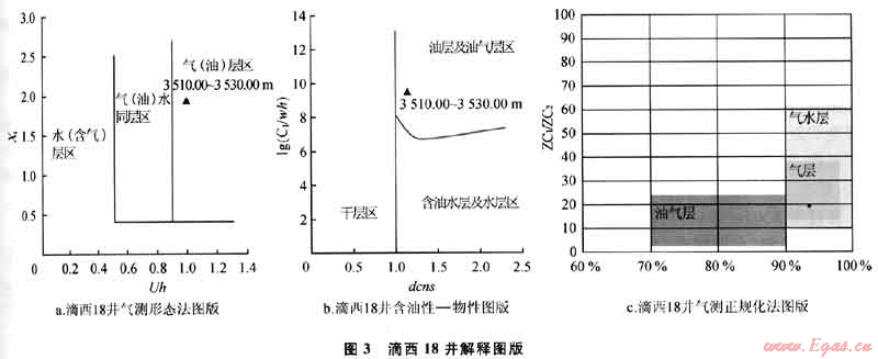 錄井綜合氣測解釋評價、常規(guī)地質資料判斷地層不含水,解釋為氣層。后在井段3510.00~3530.O0m試油,日產油26.93t,氣25.006×104m3,試油結論為氣層。